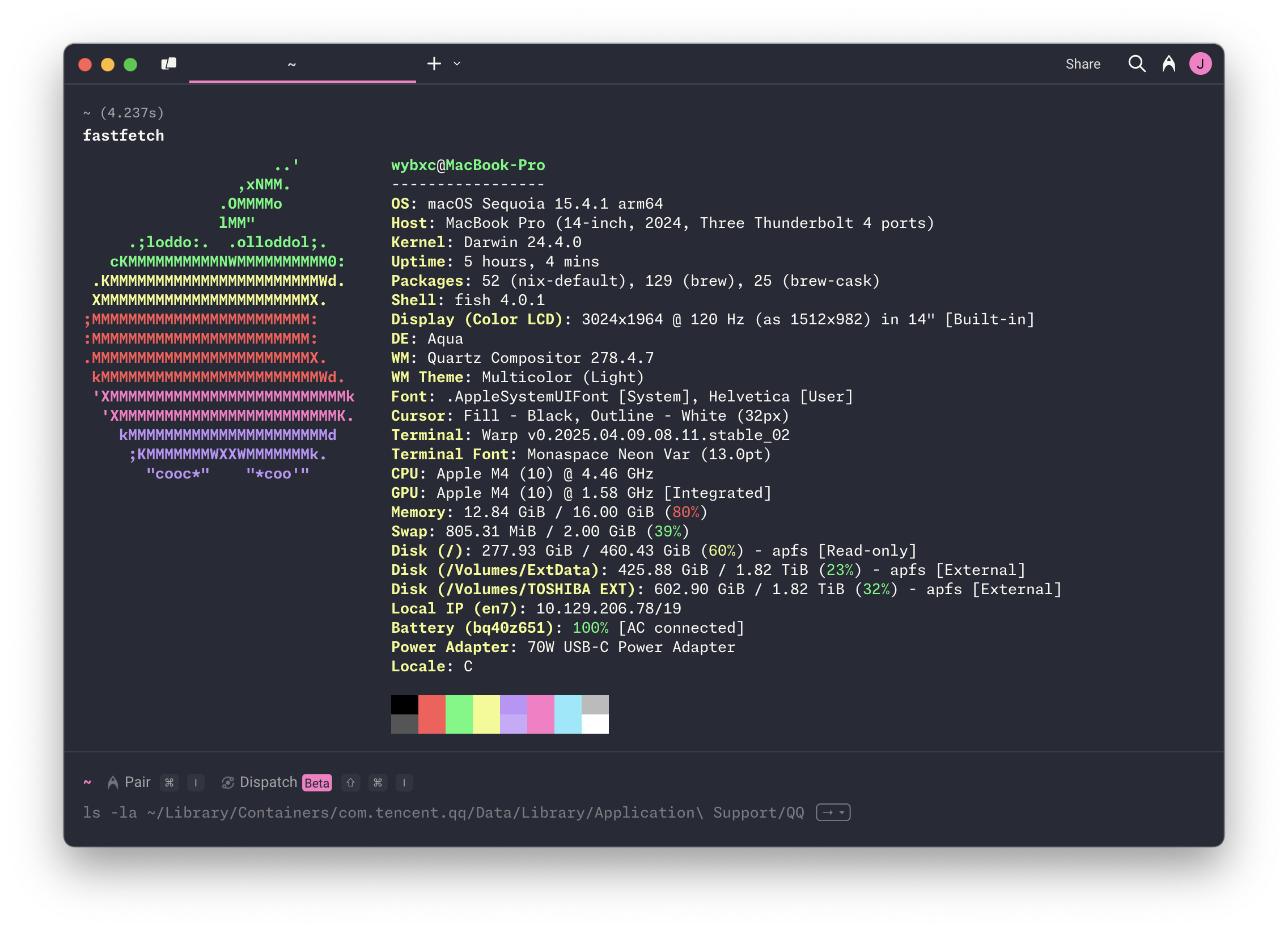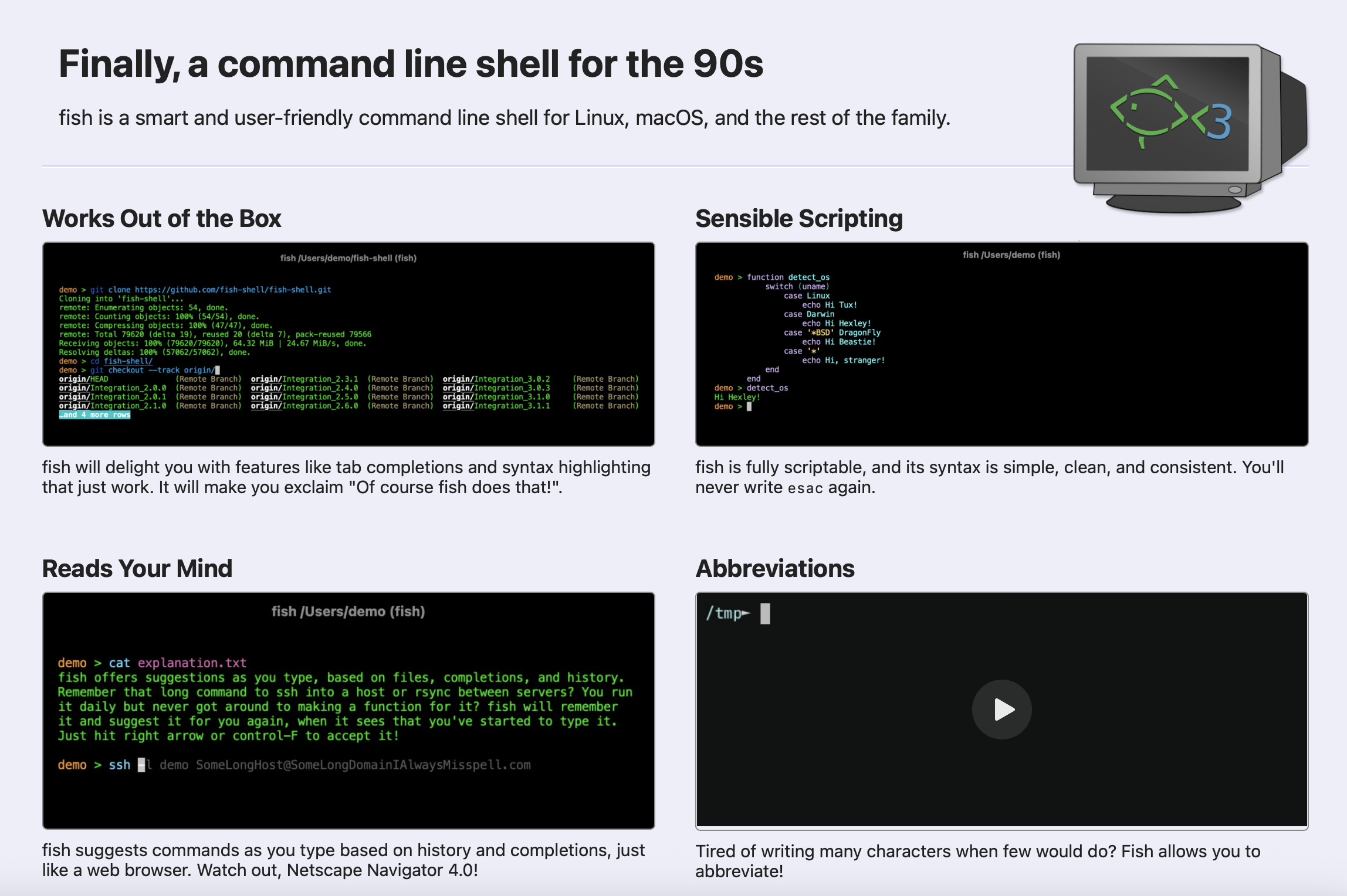 MacOS 自带 zsh,如果配置得好,用起来很顺手。可惜我之前就已经厌倦了 zsh 复杂的配置过程,所以直接选择了 fish。fish 是一个开箱即用的 shell,内置了很多实用的功能,比如语法高亮、自动补全、命令历史等。