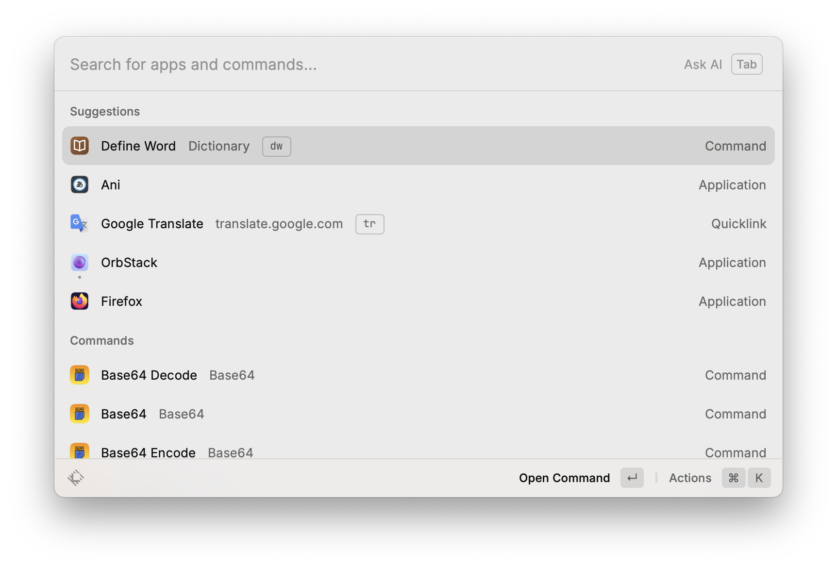 Raycast 是一个 MacOS 上的应用启动器,类似于系统自带的 Spotlight,但是拥有更多的功能。Raycast 可以用来快速启动应用、搜索文件、管理剪贴板、查询词典、打开网站等。