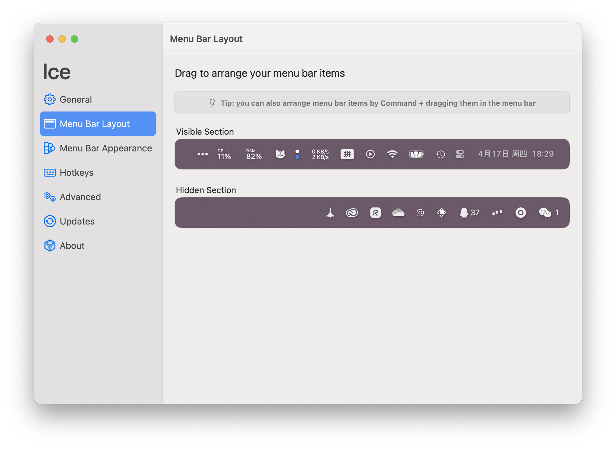 将菜单栏中的图标折叠为两级,对于带刘海的 14 寸屏幕来说,完全是必需品。收费软件 BarTender 的免费替代品。