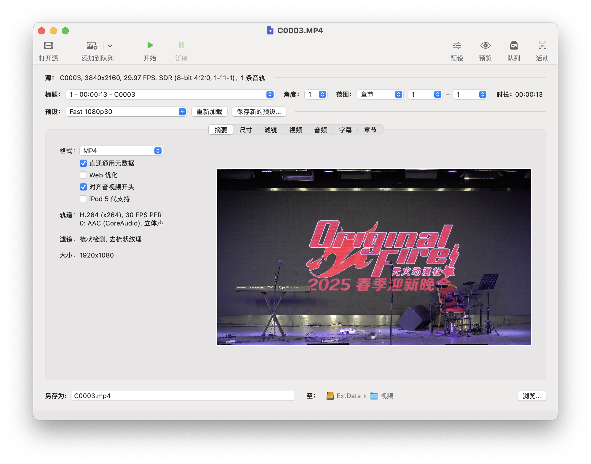 HandBrake 的界面比 Staxrip 简单一些,但还是留出了一定的专业配置空间。压制视频时可以选择用 Apple 的硬件加速,在不追求极致质量的情况下,可以达到很快的速度。