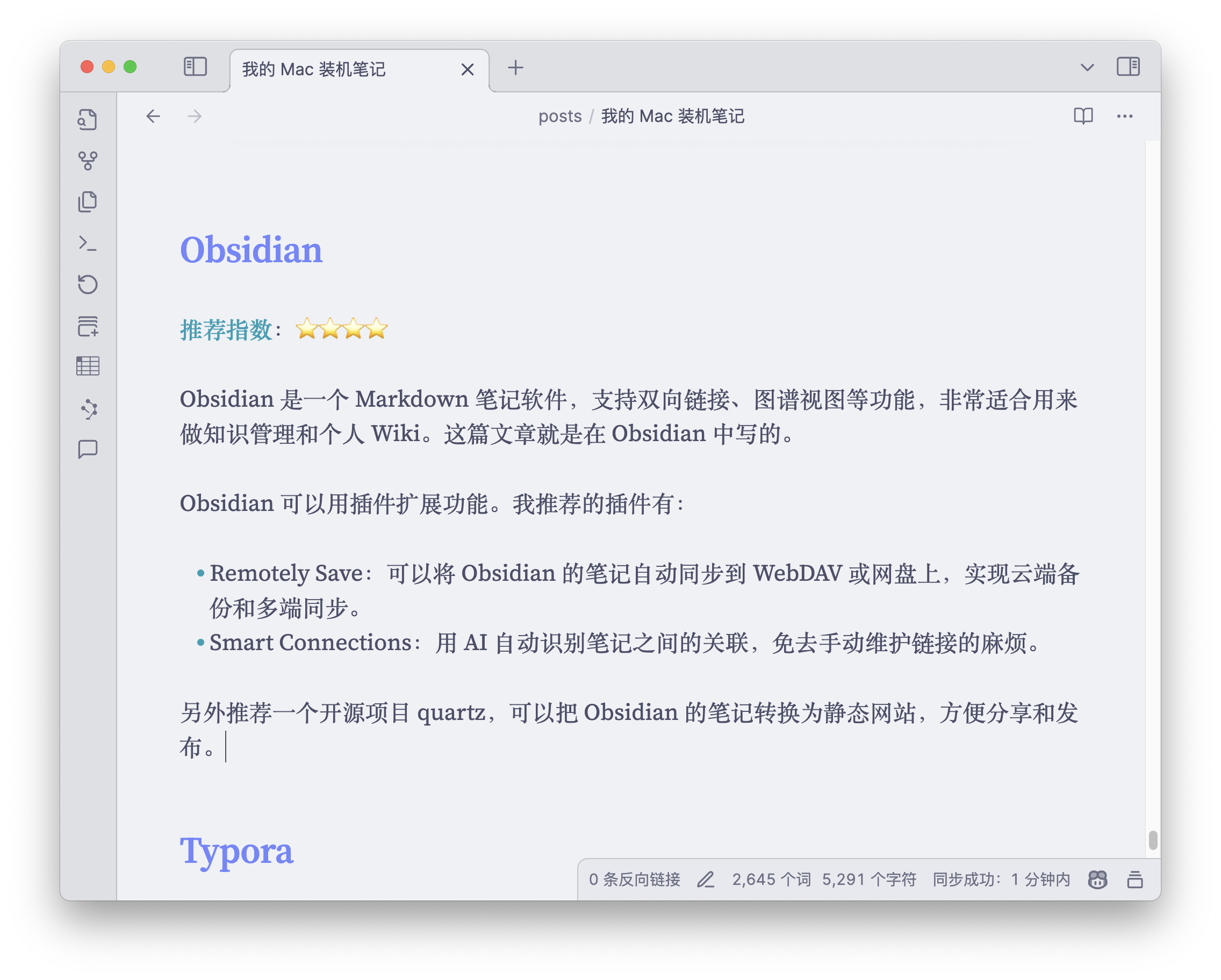Obsidian 适合用来编辑集中储存的笔记,而对于在笔记储存之外的 Markdown 文档,我选择用 Typora 来编辑。