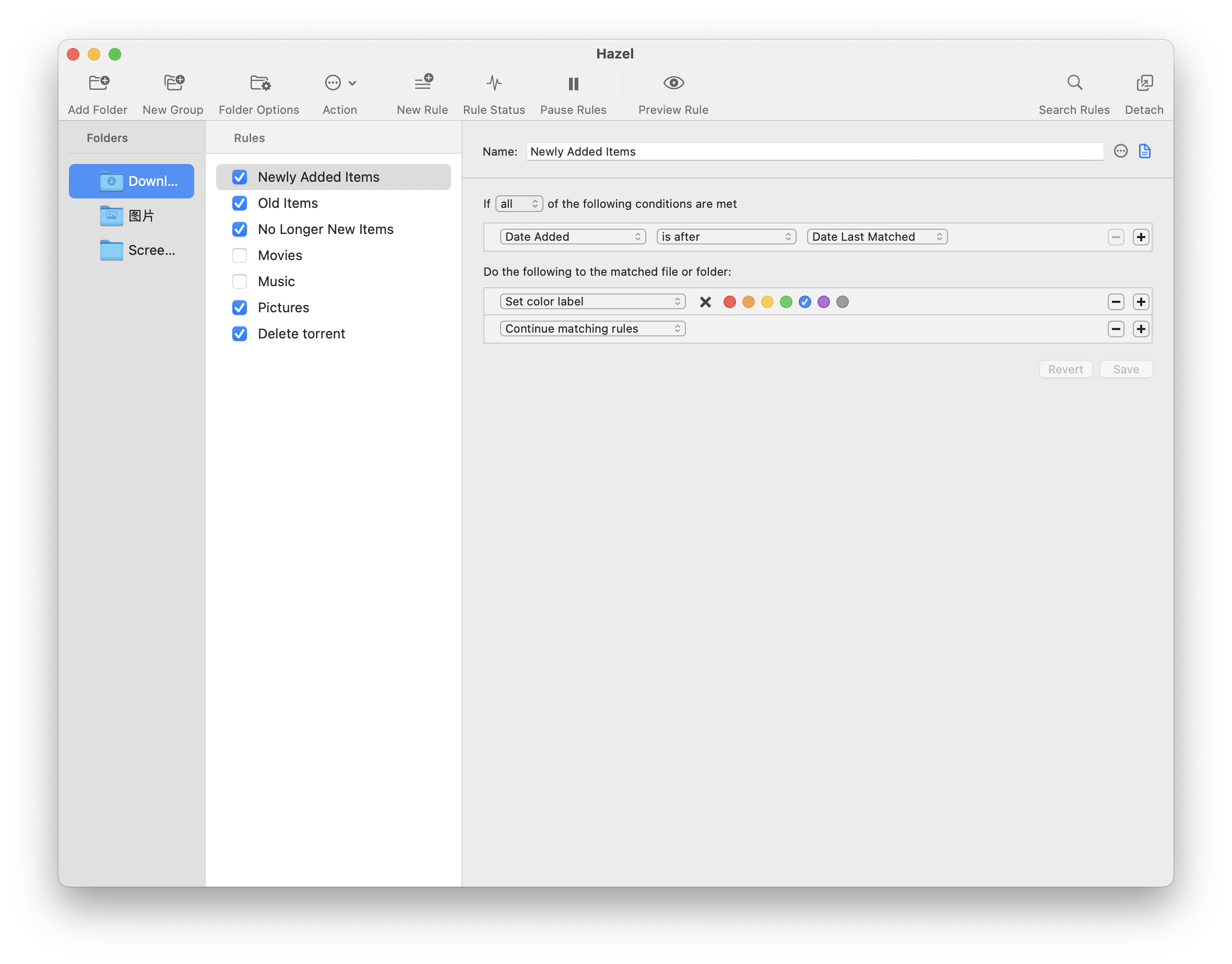 Hazel 自带几条示例规则,包括:给新下载的文件打上蓝色标签,经过一日后将蓝色标签取消,对于下载超过四周的文件打上红色标签以提醒删除。从这些规则可以看出 Hazel 的强大,但不止于此,Hazel 还能将文件按照创建时间分类到不同的文件夹中,甚至可以用 AppleScript 和 Shell 脚本实现更复杂的功能。