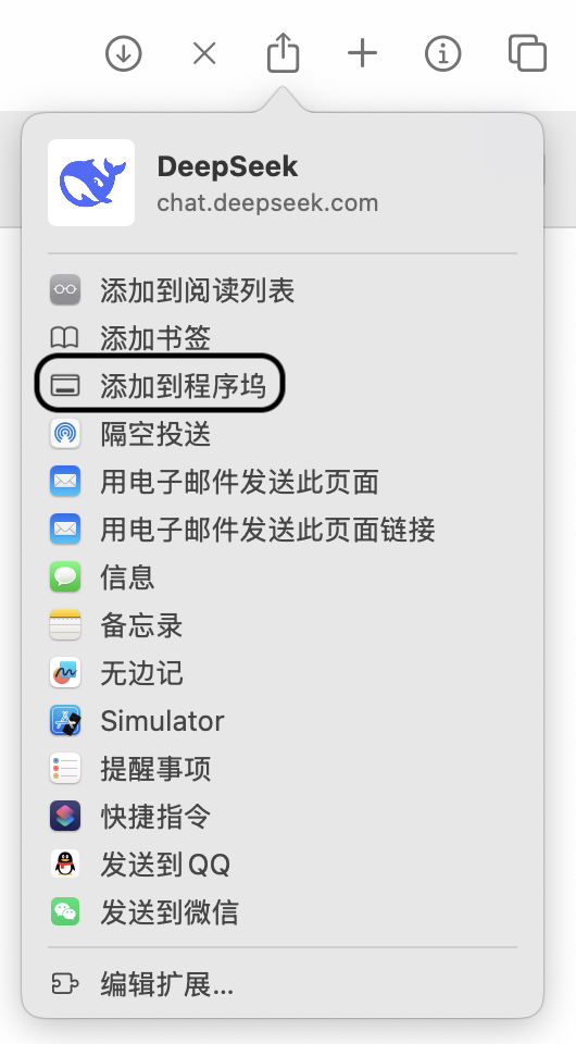 自从 DeepSeek R1 横空出世以后,DeepSeek 就成了我必备的 AI 工具。DeepSeek 的网页版可以安装为 PWA,只需在 Safari 右上角选择“添加到程序坞”,就变成了一个方便好用的桌面应用。