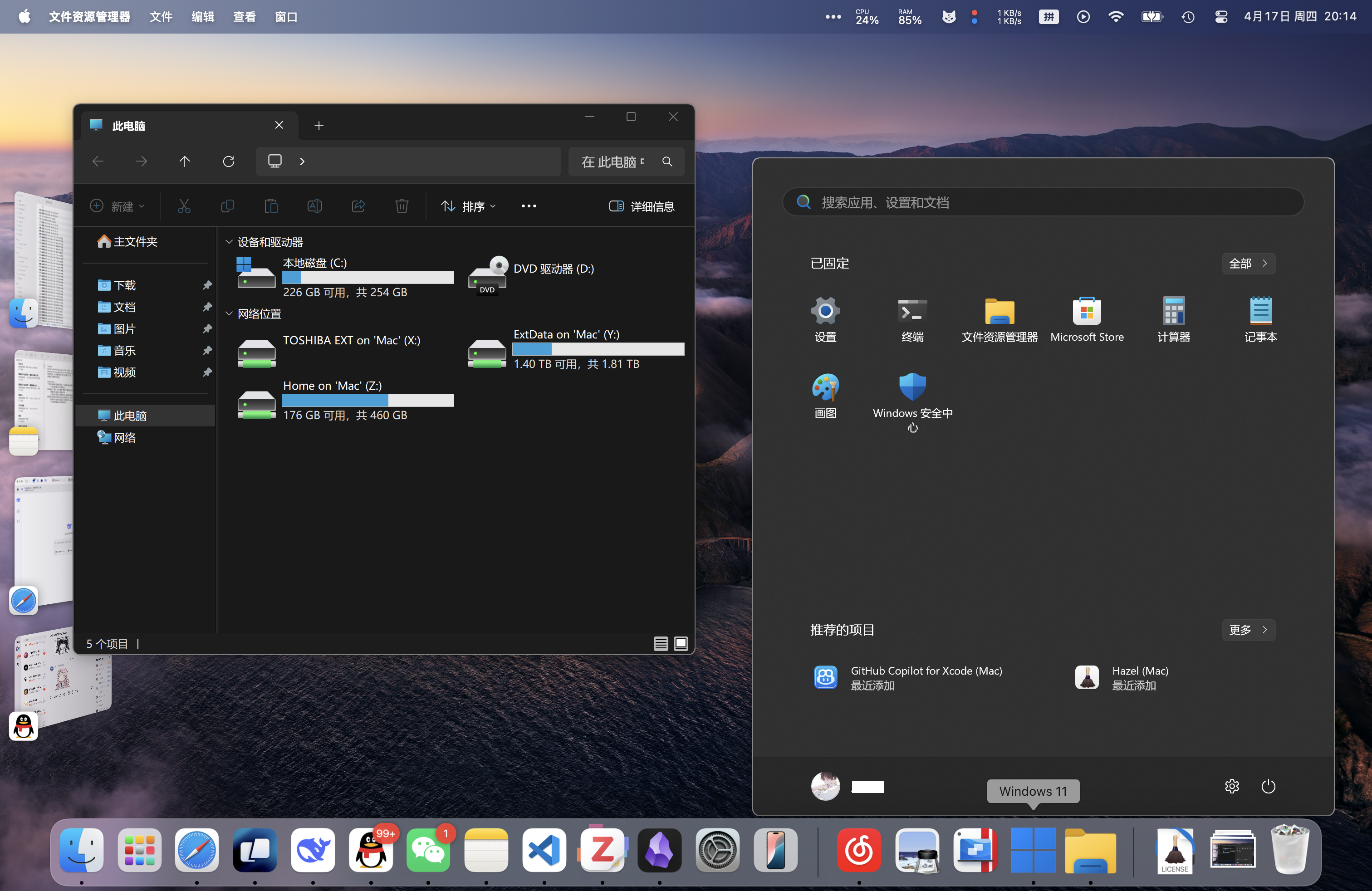 Parallels Desktop 是一个 MacOS 下的虚拟机软件,可以在 Mac 上运行 Windows 和其他操作系统。其亮点之一是支持融合模式,可以将 Windows 应用程序直接集成到 MacOS 的桌面和 Dock 中,实现无缝切换。